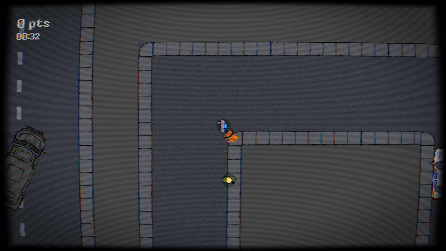 In Static Street Sweeper you play a masked madman, skating through downtown Toronto and sweeping people's legs with a hockey stick. Skate fast around roads and use your hockey stick to sweep people's legs, parry gun blasts and whack squirrels! The game is Hotline Miami style and you unlock masks with new effects after runs, each mask changes the gameplay slightly!